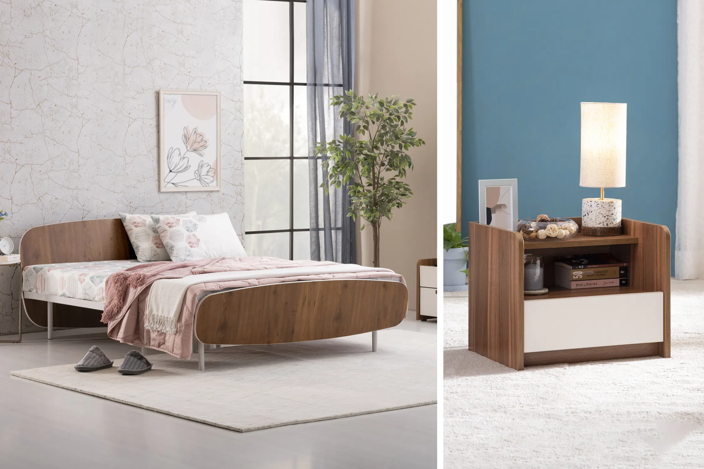 Furlenco | Blanca Queen bed with 6″ Mattress & Bianca Bedside Table