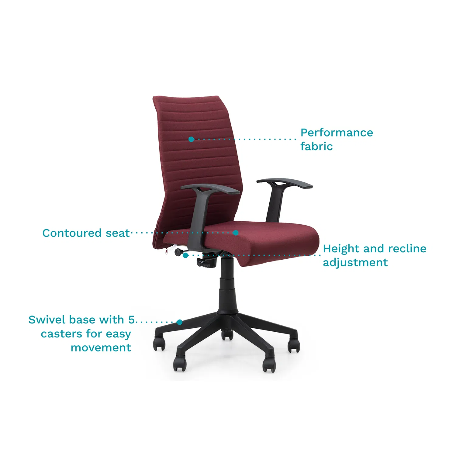 Rent our Flexo Office/Study Chair – Berry to add a beautiful pop of colour to your home office. This package includes an upholstered office chair with adjustable height, breathable mesh, and ergonomic design for good back support.