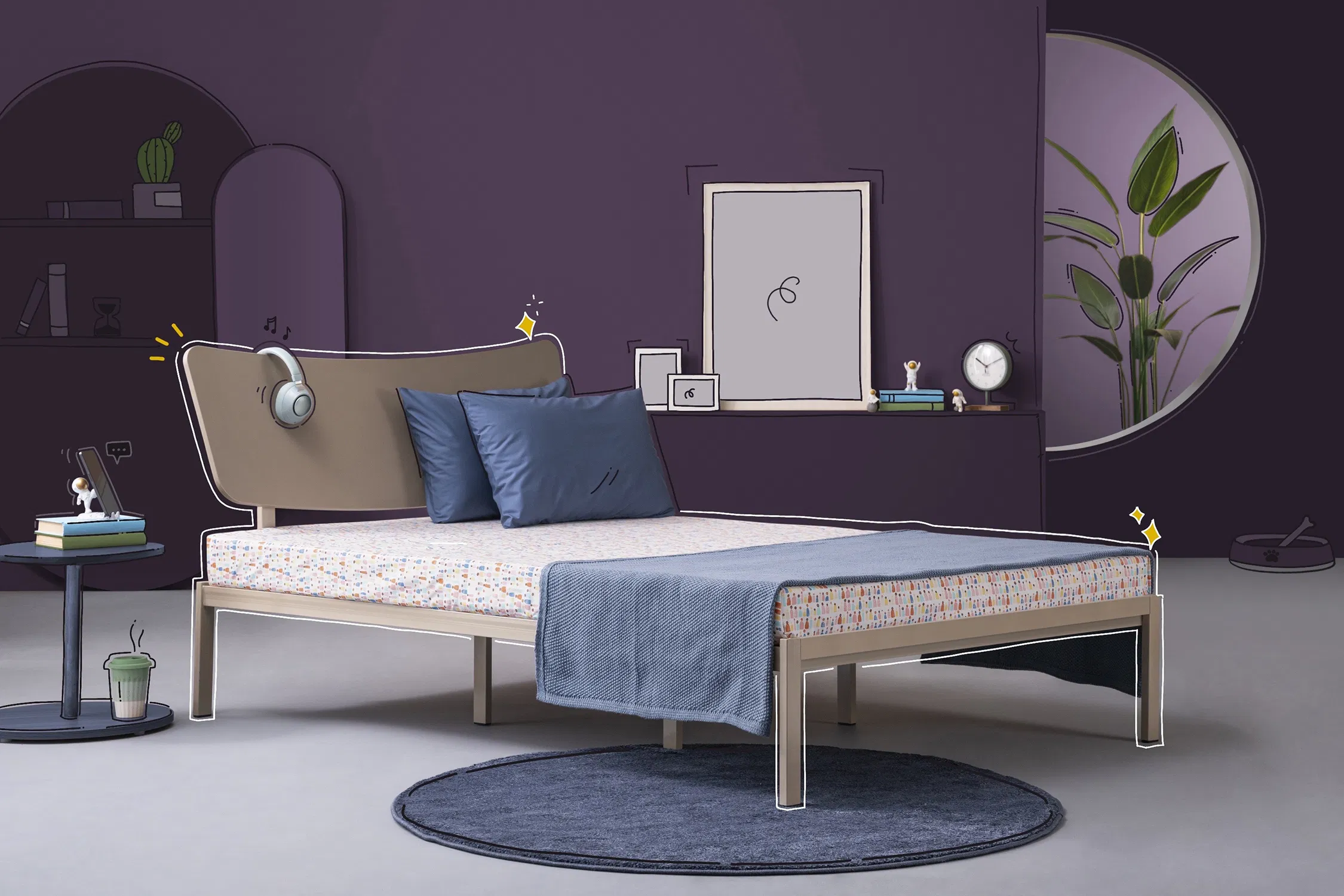Rent LIT bed. This bed offers a trendy look with a minimalistic tone that complements your bedroom. It has a robust metal structure with upswept corners that can be used to hang headphones or clip reading lamps. As the name suggests, this bed will add a LIT vibe to your bedroom.
