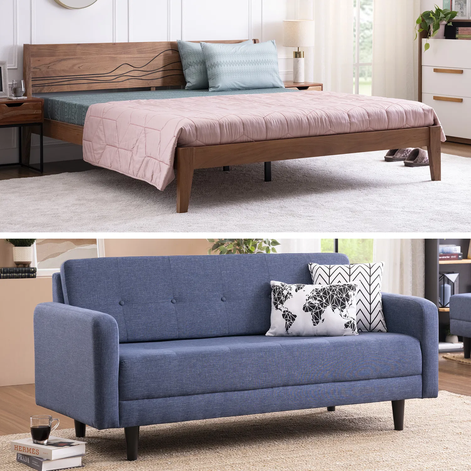 Furlenco | Mojave King Bed, Mattress & Noah 3 Seater Sofa Denim Grace