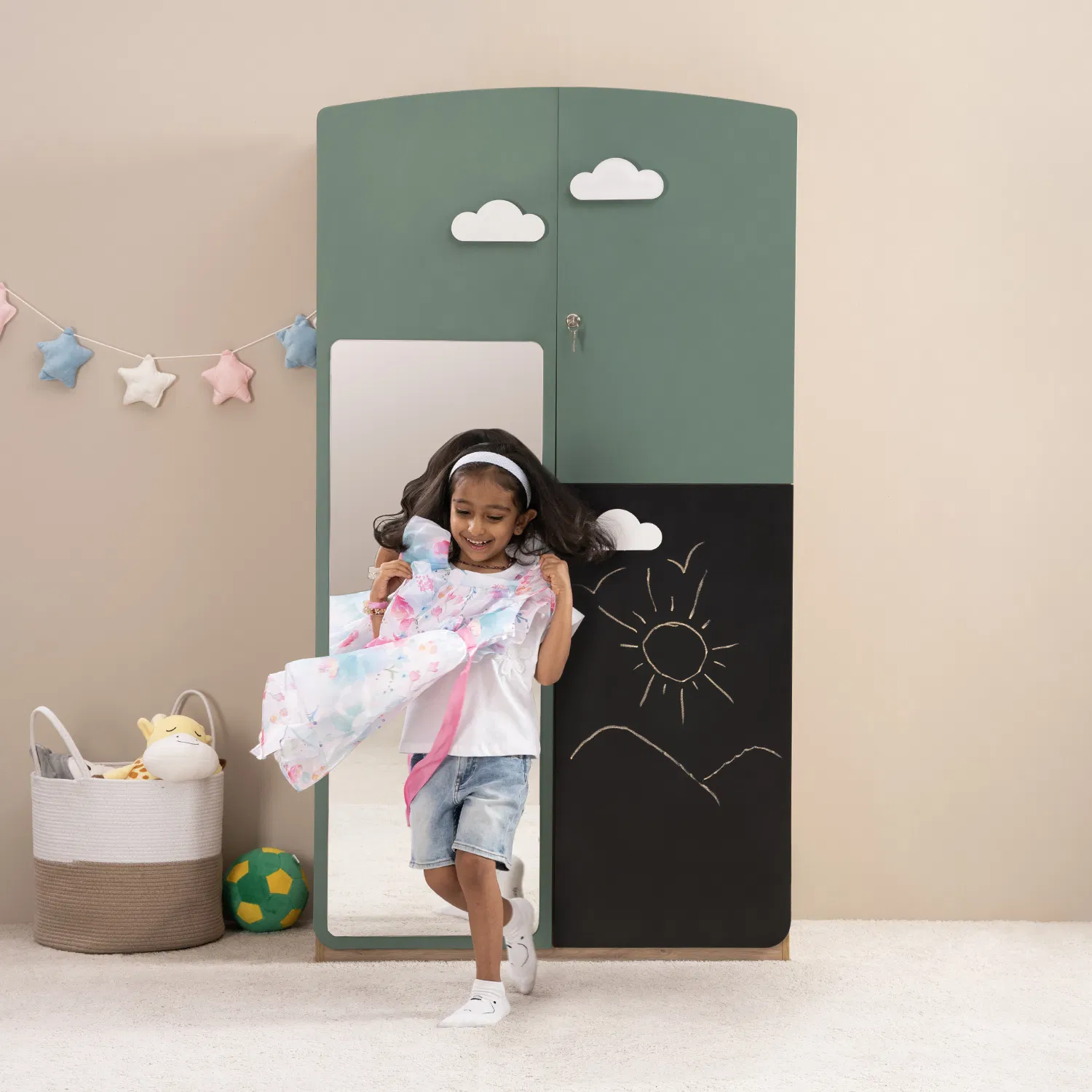Rent the Cloud-Themed Kids Wardrobe – A cheerful storage solution made for little explorers. With three spacious doors, it neatly organizes clothes, toys, and books while keeping everything within easy reach. The hanger rod makes dress-up moments fun by letting kids see and choose their outfits, while shelves at varied heights pair well with most storage boxes for a clutter-free space. Finished with playful cloud handles and pastel tones, it brings a dreamy charm to any nursery or kids’ room.