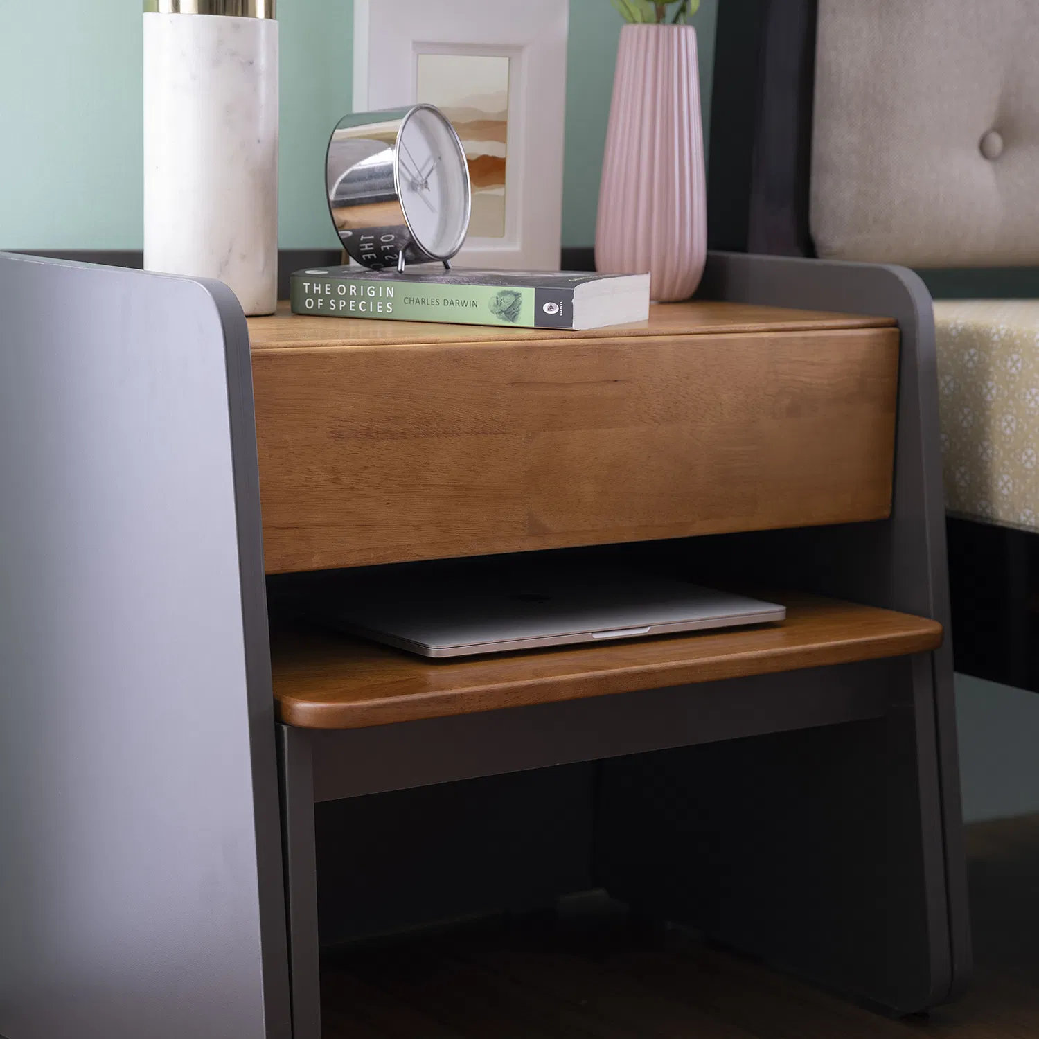 Rent the Roo Bedside Table – Get bowled over with the inspiration for this ingenious table-in-a-table. Inspired by a nesting kangaroo, with the Roo Bedside Table you own two tables- one nesting inside the other. The trendy combination of a solid grey and wooden texture makes this hard to miss. And, the convenience-centric design works really well when you plan to work or dine in bed.
