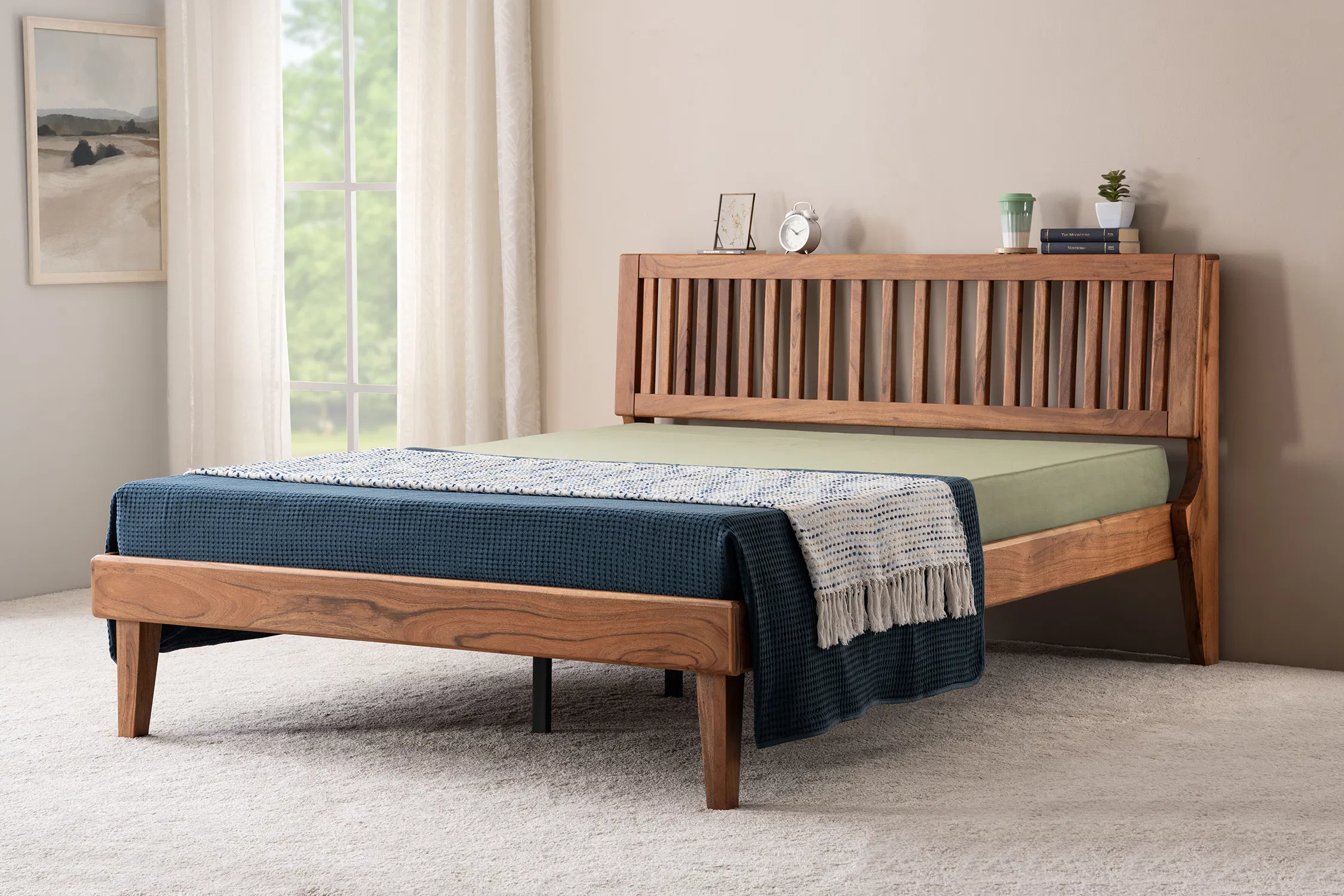 Rent Sara Solid Wood Queen Bed. It is designed to impress, the headboard features rhythmic slats adding depth and visual interest to your room. The inclined headboard isn’t just for looks—it’s ergonomically designed for ultimate back support, perfect for reading or relaxing in bed. The sleek, aesthetic leg profile gives it a modern, elevated look, while the Teak finish brings warmth and richness to your space. Crafted from durable Acacia Solid Wood, the Sara Queen Bed is built to last and adds an effortlessly chic vibe to any bedroom.